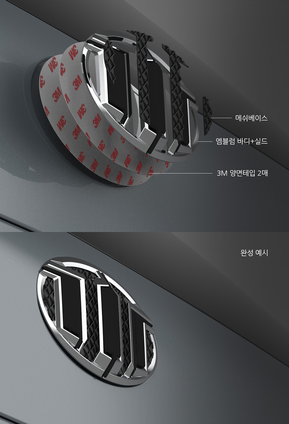 [전면 엠블럼] 아래 이미지를 참조하여 순정 엠블럼 홈을 덮듯이 장착하세요.